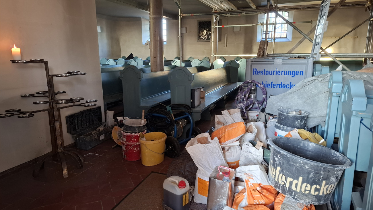 Die Fortschritte am Kirchturm werden bald ganz zu sehen sein. Neu eingedeckt, mit restaurierten Turmzier, einer Zeitkapsel (darin enthalten: eine Tageszeitung, eine kleine Tageschronik, Fotos von der Sanierung, Rundschauseiten vom November und die Predigten der letzten Gottesdienste) und einer Uhrzeit, die man wieder sieht - auf erneuerten Ziffernblättern.