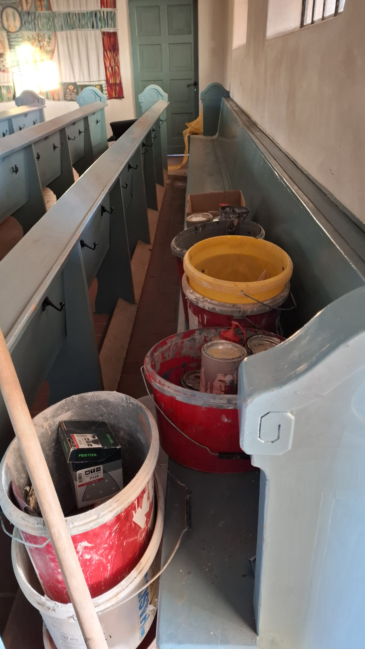 Inzwischen wurde unsere Kirche auch innen eingerüstet, um die gesamte Raumschale – also Wände und Decken – zu reinigen und neu zu tünchen. Auch die sogenannten Turmzier, also die vergoldetet Kugel samt Metallfahne, wurde von der Turmspitze heruntergeholt, um restauriert zu werden.Zum Schutz vor den Innenarbeiten wurde nun die Orgel „eingehaust“. Das heißt, sie wurde in eine Spezialfolie verpackt, die Baustaub fernhält, aber trotzdem die notwendige Belüftung zulässt.